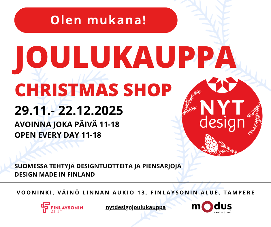NYTdesign on vuosittain järjestettävä suomalaisten designtuotteiden joulukauppa Tampereella, tunnelmallisessa Finlaysonin miljöössä. Tänä vuonna joulukauppamme on avoinna 29.11.-22.12.2025 joka päivä klo 11-18.